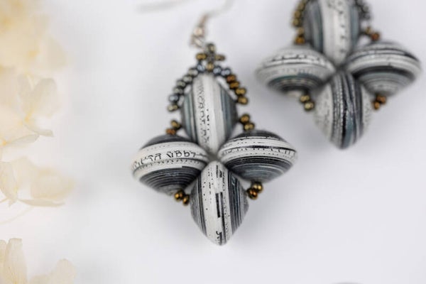Wokoscrafts Zambarau Paper Bead Earrings are made with glass beads and gold-plated stainless steel, so they won’t rust. The color of the paper bead earrings comes from an art magazine.