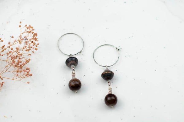 Wokoscrafts Osiepa paper bead earrings are made with vintage glass beads and silver plated stainless steel, so they won’t rust. The color of the paper bead comes from a magazine. The earrings can be worn on those days when you feel calm and bold.
