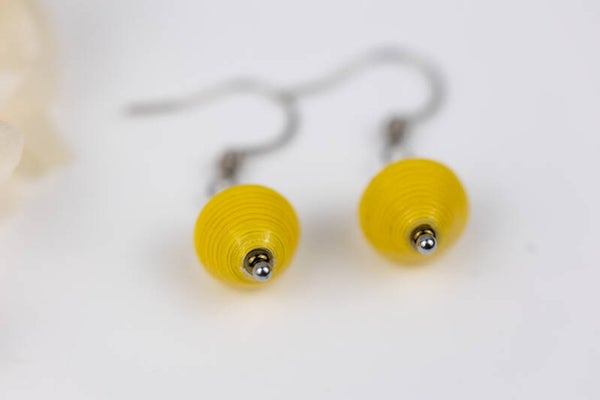 Wokoscrafts Mrembo Paper Bead Earrings are made with glass beads and gold-plated stainless steel, so they won’t rust. The color of the paper bead earrings comes from hand-painted paper.
