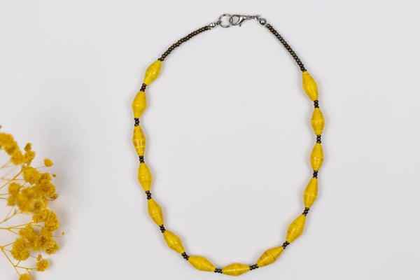 Handmade paper bead necklace in light green and white, featuring eco-friendly seed beads and a secure lobster clasp. Each bead is carefully crafted to create a lightweight, durable piece that’s perfect for adding a pop of color to any outfit. Created from a flyer design, this necklace is ideal for casual wear or special occasions and makes a thoughtful, sustainable gift.